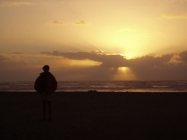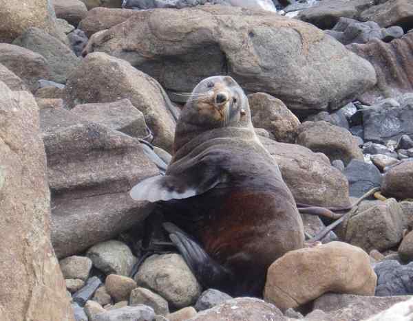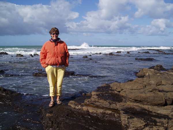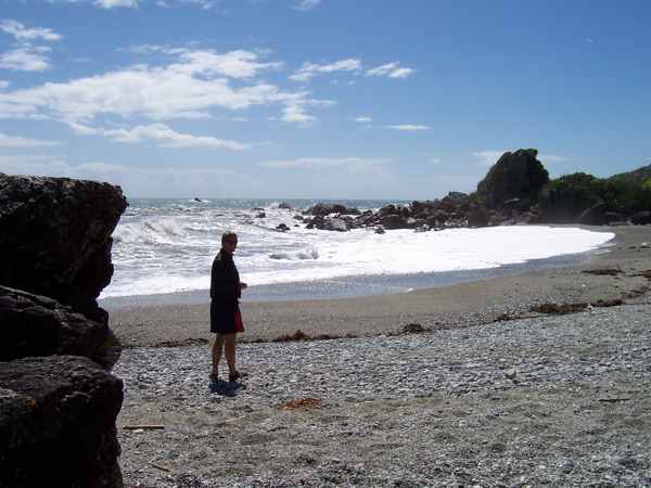 Curio Bay, 120 million years ago, stood tall with tropical trees. Some petrified stumps are now visible on the rocky beach. No, not that one - that's Barb :-)
