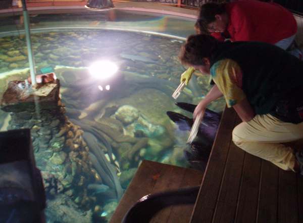 Rather than us eating eels, Barb's feeding them squid scraps. Some eels here are older than 100 years and were rescued long ago from a defunct eel farm.