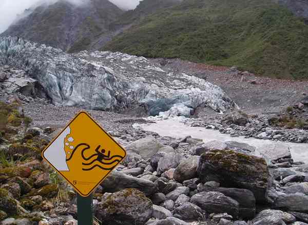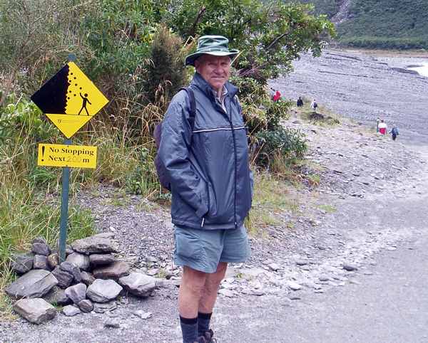 Dad's standing on the trail to Fox Glacier. It flows down a very deep canyon, hence the warning about falling rocks.