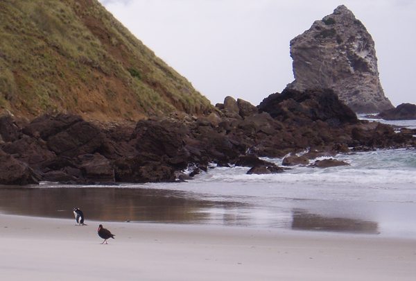 Near the South Island's south tip we spotted this Yellow-Eyed penguin. An Oystercatcher grabs the limelight in the foreground.