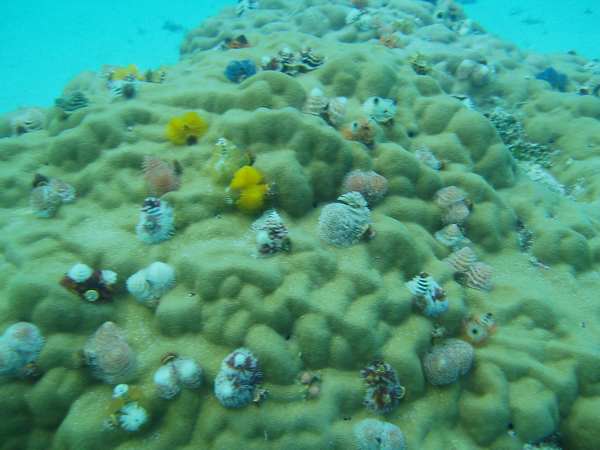 The multi-coloured Christmas Tree worms live inside tubes, usually found on coral boulders. Their extended gills give them their name.