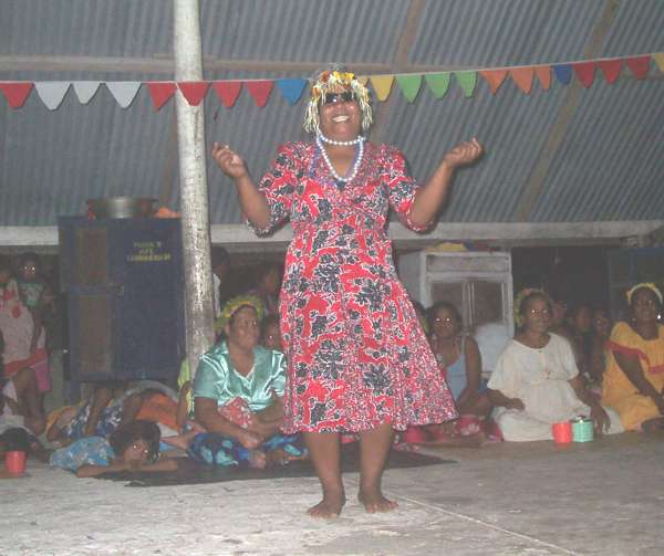 A couple of weeks later there was another beauty contest, this time the occasion was Youth Day, and part of the New Year celebrations. Eight youth entered, three boys and five girls, one of whom was Bruno's daughter Magali. The contestants got points for wearing certain things, including sunglasses and shoes. Many of the shoes fit poorly and it was quite obvious by the awkward walking that wearing shoes was a strange thing indeed. As the event was held in the Catholic maneaba, each contestant had to answer a question of some religious importance. Judging by the laughter, we aren't sure how many correct answers were given. We did learn that Magali named the priest on Kiritimati Island when asked who the Pope was; we aren't sure how much this affected her standing. Again, there was dancing between contestant activities, a respite from sitting cross-legged on the floor. Later, when the prizes were being distributed, Magali (who speaks Kiribati, French, and English) called across the floor to Ana that she was supposed to go up to the front and collect a prize, we think for dancing. When you don't understand the language you are at the mercy of your translators – Ana didn't believe a word of it but lo and behold, a man walked over and presented a handful of candy. I too was called up to the officials; whatever they said in Kiribati I'll never know, but I enjoyed my lollipop anyway, saved one for Bjarne who had stayed on the boat, and gave the rest to some kids. The most perplexing prize was $10 received by Gigi, who didn't dance at all. She found out later it was a gift from an anonymous admirer. We all underwent the Kiribati tradition of being doused with baby-powder and squirted with scent.
