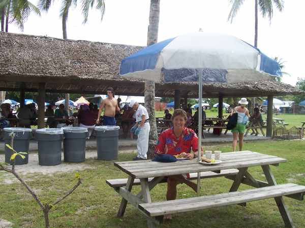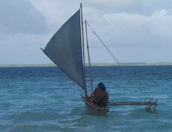 Once the painting was done, we learned that there was no mast, boom or sail; we didn't get involved in those projects except to contribute some spare line and blocks. Bwaraatu was very proud of his canoe and was keen to take us out in it. He was able to borrow the rigging from a friend, but then we learned that he didn't really know how to sail it either! Luckily the friend was also willing to provide lessons and to take us out with Bwaraatu. On the arranged afternoon only Bjarne went; I was waiting to borrow Norman's sat phone as I hadn't gotten any email yet about when my Dad's heart surgery was going to be (he'd accidentally sent the info to the wrong email address). Bwaraatu's friend was available then so I said go ahead. I met up with a rather damp Bjarne at the beach as he waded ashore after a short sail. It wasn't a dry ride, but Bjarne was impressed with the speed. The tacking is interesting: to turn around, the mast is taken down and then put up at the opposite end of the boat. It looked like fun and I thought Bwaraatu's idea to take both Bjarne and me across the lagoon one day for a picnic, was a great plan. It was put on hold, however, until I returned from my trip to Victoria (I was away for a month - see Barb's Detour for more on that adventure).