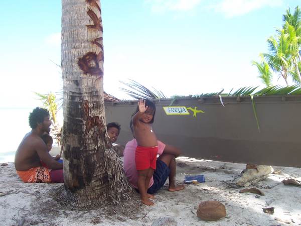 The final touch of the painting was putting the name on the boat: Freya! Hey, it was Bwaraatu's idea, not ours, but we were touched that he wanted to remember us this way. We actually had a spare vinyl appliqué saying “Freya” in our chosen font, courtesy of Bjarne's coworker Stacey. Bwaraatu's outrigger was the perfect place for it. We even painted on a silhouette of a frigate bird (the bird that is so prevalent at this island, and which is on the Kiribati flag), making the whole thing look pretty spiffy. Bwaraatu thanked us for our help by giving us the the shark-tooth knife we had admired when we first met him.