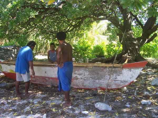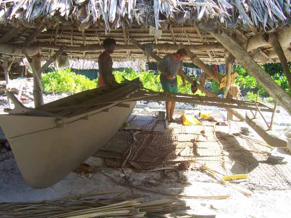 Shortly after arriving at Tabuaeran we met Bwaraatu when he stopped by Bruno's. Bruno, who lives much closer to the NCL grounds, had been storing Bwaraatu's sharks' teeth knives for him. He didn't have much time for making knives anymore: since his wife had recently passed away he was busy caring for his 9 children. We admired his handiwork and thought that maybe later we would purchase one. A few days later we were chatting with him and discovered he had an outrigger sailing canoe that was grounded because it had a “small hole” in it. We offered our help with the repair and arranged a time to meet where the canoe was stored. Like any good boat project, this one turned out to be much bigger than first thought!