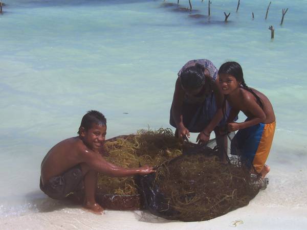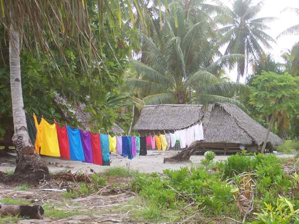 The main sources of income for the island are the cruise ship, copra and seaweed farming. Harvesting copra is back-breaking work. Producing seaweed is less strenuous, and the whole family gets involved in the work. I think more harvesting of seaweed is done when the children are on their 2-month Christmas break. This child labour didn't seem too onerous judging by the splash fight and other playing around in the water that we observed as some children dragged a load of seaweed to shore. The mother then helped haul it in and spread it out on tarps to dry in the sun, while the father used small line to tie individual sprigs of seaweed evenly spaced along a thin rope as starters for the next batch of seaweed. These ropes are strung between posts in the shallow lagoon, where the seaweed grows quickly in the tropical sun. Dried seaweed is stuffed into a sack, and brought to the seaweed agent who weighs the sack and gives a chit for the amount of produce. The family can't cash the chit until the cargo ship arrives (maybe 4 times a year) to pay the agent and collect the seaweed. The chits take on a life of their own as some stores will accept them instead of cash. The seaweed is sent somewhere in Europe to be processed into carageenan and agar.