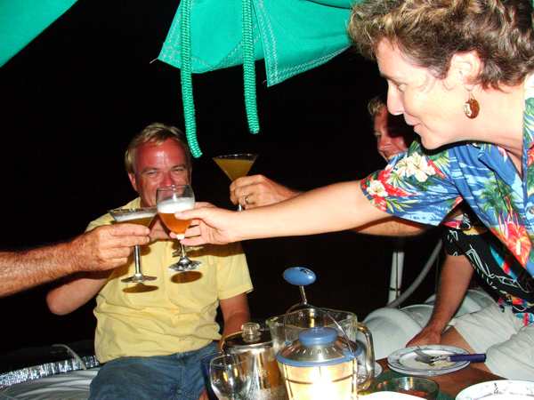 To our relief, once noticed we were quickly invited to some festivities. There was enough time to rest a little and bake a cake before going ashore, first to Bruno's house for a cocktail, and then to what we thought was a party and beauty contest. Instead we ended up at a church service, an unpopular event for a group of I-Matang who wanted to celebrate the New Year! We made our escape as soon as it seemed inoffensive and went back to Wolfgang and Ana's boat, Argos, where we had splendid food, very strong blender drinks and lots of laughter. Some outdated flares were set off at midnight: the few that worked drew no response from anyone on shore, which in the context is good but demonstrated that flares have a limited usefulness – definitely better to not sink. In addition to our hosts, we were joined by Bruno, a French expatriate who lives on the island with his 12 year old daughter (Magali), and some French-Canadians from Giva, Val and Gigi. The champagne was barely opened when lack of sleep from our passage caught up to us. We bid good night and Happy New Year to our new acquaintances and slept until well into the new year.