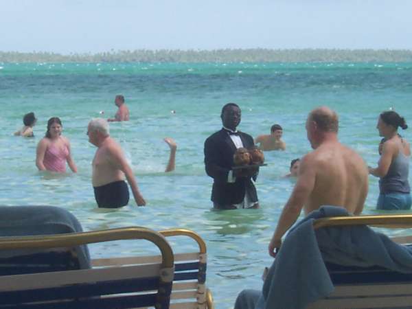 On January 2nd, more eating was in store for us: the cruise ship was in town! Before going ashore, we did our best to look presentable and act like tourists; we thought we were blending in nicely, except for being better tanned, when we suddenly noticed we had forgotten our shoes! Not too many people look down, so we successfully made it through the lunch line and enjoyed our first hamburger in months. The Norwegian Cruise Line (NCL) area has a pretty beach, nicely maintained pathways with landscaping, a beach volleyball court, a basketball court and some open huts where the food is served from or drinks can be purchased. Coconut trees are carefully castrated so no tourists get head injuries from falling nuts. When the ship is absent it is a tidy ghost town, except for some activity on the basket ball court. On cruise ship day about two thousand mostly pasty-white people flood into this compound, where they lounge in the beach chairs, rent sailboats, or venture further afield either by bicycle or packed into the back of a passenger truck. A common stop is the primary school that NCL built, and some of the passengers bring donations or games and candy for the children.