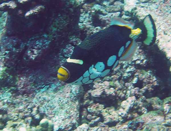Although the water inside the lagoon wasn't clear most of the time, outside it was often quite nice. The pass was best at tide change or when the tide was coming in. It was also important to be aware of the tides because the current could become quite strong; after one dive, our little engine wasn't able to make it back through the pass. We had to land outside the pass and pull the dinghy along the shore. We did some underwater exploring with Wolfgang and Ana, who are veteran divers with over 500 dives. I thought breaking 50 wasn't bad. We availed ourselves of their dive compressor. The coral was never fantastic but we did see some good sea life at times, including manta rays, turtles, eels, and a clown trigger fish. A fun trick was to motor out the pass near the end of the outgoing current and snorkel back in when the current changed direction (while towing the dinghy). We saw some large Napolean Wrasse (3-5 feet) this way, and other large fish. It was fun to zoom by, but we couldn't stop easily if we wanted a closer look at something.