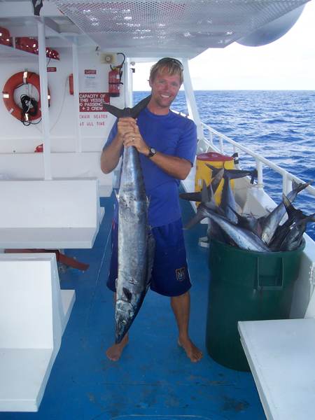 Bjarne also went fishing with the NCL crew one day. I was suffering from shingles then so stayed home to recuperate. They took one of the big tenders for ferrying cruise ship passengers ashore, outside the pass and maybe a half mile off shore, where they sought out fish by observing where the birds were congregating. Three lines were towed behind the boat, with bicycle inner tubes acting as snubbers. There were no reels and the large fish were hauled in hand over hand - 31 in all! Bjarne brought home some Wahoo and yellow fin tuna. Fish and birds weren't the only wildlife around: they also were visited by a pod of dolphins.