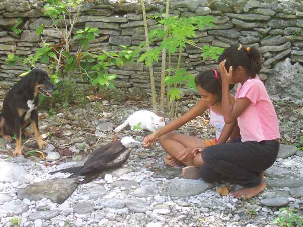 In addition to mosquitoes, Bruno's pets include a dog, a cat, and even a frigate bird. A number of the locals have trained frigate birds up from when they were babies so these birds will return to that house and accept food there. People often mark their birds with some ribbons on their wings. We were amazed one day to see Magali coax the bird onto the ground, and while she fed it, both the dog and the cat sat nearby, inching closer to the food and watching carefully, but not interfering. Magali even teased the bird with the cat's tail, waving it in front of the beak, while the bird tried to snap at it. The cat tolerated this for a lot longer than I expected!