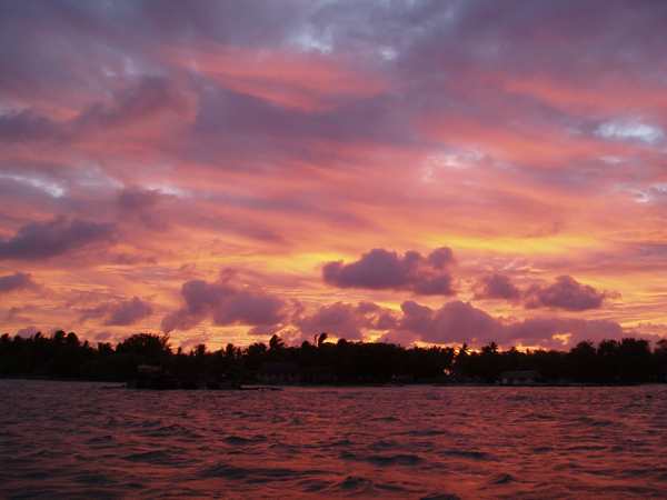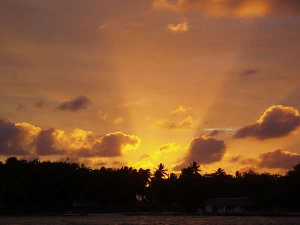 We left after 1700h (I had called BJ on the hand-held and he was still alive) and had to walk the outrigger a fair distance since the tide was out. We also stopped along the way to retrieve the fishing net (and the fish) that had been set out while I was on shore. The smaller fish that were caught were picked up with the net around them; the men would bite the fish heads to kill them and then remove them from the net. The larger fish were just taken out and left to gasp on the bottom of the canoe.
