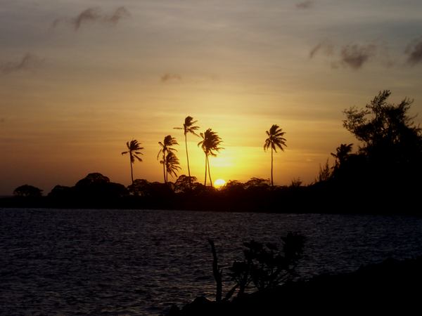 The strong wind that was so annoying in the anchorage, however, provided a cooling breeze to those on shore and helped keep the mosquitoes and flies away. The Doldrums, which move around, brought unsettled, squally weather to the area fairly often, but this diminished as we moved closer to spring. When we got especially grumpy, say after a newly-cleaned shirt had been a-salted by a large wave, we put it into perspective by reminding ourselves about the winter weather in Canada; we knew we would never get any sympathy from anyone back home. Even when the winds were high, the sun shone frequently and the temperature was warm. Sunsets [1] [2] [3] were often beautiful and sometimes absolutely gorgeous, followed by many clear nights where we had no trouble watching Orion chasing Taurus across the sky.