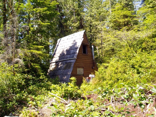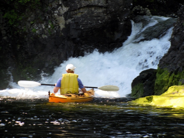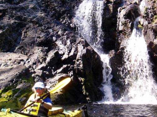We beached the dinghy at Cataract Creek and tramped up a very slippery creek bed. The going was slow not only from slippery algae-covered rocks, but also because the water was flowing at a good clip. Neil and Peg decided the tramping was not for them so they turned about and headed off in their kayaks to paddle elsewhere. We stubbornly carried-on. Barb's cougar sticks and our sandals helped when fording the creek, though each time we stubbed our toes on the rocks we were wishing for closed footwear. A couple of times it appeared our progress would be faster if we took to the adjoining rainforest, but the open regions under the towering trees frequently gave way to impassable salal and salmonberry thickets, so we alternated between a water and land route. Don't know how the early explorers did it...