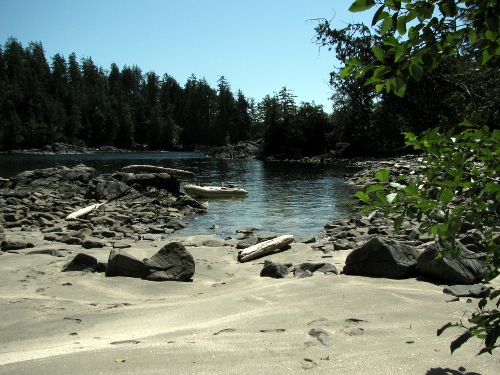 Just before lunch the fog began to lift. The sunshine inspired us and we headed off to Equis Beach (site of abandoned Sechart village) near the Pinkertons. Because it was a short trip we put up only the main and motor-sailed. On the way, we discovered that cherry pie filling and cream cheese work well together as topping for bread. Because the winds seem to pick up in the afternoon, we headed off on our exploration soon after anchoring. This area tended to be very shallow, with tidal flats and long shoal areas. Getting around in the dinghy was a little tricky since we couldn't resist seeing if we could push through these shallow channels full of sea grass. We ended up poling the dinghy, and at times getting out and walking it along. The water was beautifully clear and we spotted some type of ray fluttering away from our feet. Equis Beach has a history of being used for various purposes, including a whaling station and cannery. Our guide book suggested that one could see remnants of the previous human activities but we had limited success with this. Nonetheless, the beach walk was pleasurable.