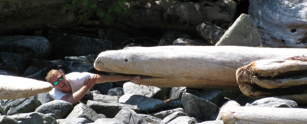 There was no moss growing on us today. Soon after setting the hook we were into the dinghy, grabbing our left-over pizza on the way out. Our motivation for haste was again to do our exploring before the afternoon winds got too boisterous. Off we went to circumnavigate Dempster Island. We came upon a sheltered lagoon where, lo and behold, there was a small beach.