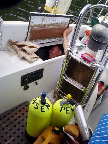 Are we done yet? Don't be silly. The cockpit locker apparently needs cleaning out since all the stuff is out. And while we're at it, look at how this scuba tank is corroding under the paint. Better scrape that bubbling paint off and clean the aluminium-whatever powder off it. Hmmm, now we have a mess of yellow paint chips and powder in the cockpit. Better clean that up too! Finally, the cockpit locker was reassembled, the second winch was back together, and I was able to resume the job I had started. From that point on, it was the straight-forward, easy job it was supposed to be.