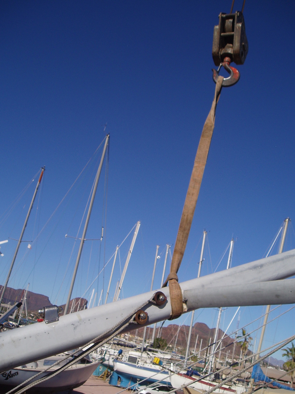 Hoisting day finally arrived. We were keyed up and ready at the set time (0800h) but found ourselves cooling our heels for the next hour and half. Apparently there was some trouble with the crane. Although the winds were likely to increase while we waited it did seem important to ensure the crane was working well. From the cockpit, about 12 feet off the ground it felt strange to see the airborne mast fly by while I stood by helplessly. Whenever the big machines get involved, whether it's a Travelift transporting the boat, or a crane lifting the mast, you can prepare as much as possible but, at some point, you have to give up control of the proceedings and put your faith in the equipment and the operator.