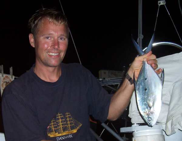 Fish was on the menu more often, mostly thanks to Chuck. Aside from feeding us from his catches, he invited us to join him in fishing off his boat after sunset. The fish were attracted to a bright light shining into the water. He used several hooks spaced along one line, which he would quickly lower to the bottom, slowly bring to the surface and then drop again (jigging). Bjarne caught some Golden Trevally this way.