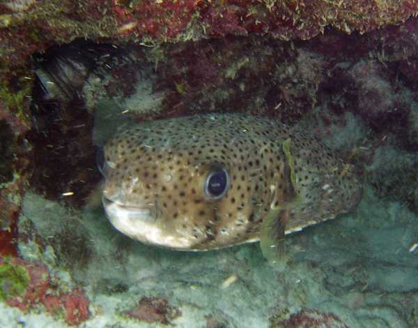 Once the clarity improved, we spent more time in the water. The coral at the anchorage is not very exciting but we saw some neat fish. Puffer fish were fairly common here, and we saw a type we hadn't yet encountered in real life, the porcupine fish. The chubby cheeks and big eyes make this shy fish quite cute. There were a lot of flounders as well. These pancakes with eyeballs can flee incredibly fast when threatened, but otherwise glide gently along the sea bottom, propelling themselves with rippling edges. We watched with fascination as one moved over the white sand and then onto some dark brown and green coral, changing colours dramatically to blend in well with the background. Just for some variety we went for a night snorkel with some folks who were doing a SCUBA dive off the pier. They had set up powerful lights to shine down from the 60 foot wharf which attracted two groups of fish – long skinny ones (ballyhoo) that stayed near the surface and round ones with long split tails that swam about a metre below. The lights attracted more fishers as well and we had to make sure we avoided their many hooks. A few days later, looking down from the same pier we had a great view of a young Manta ray, doing graceful somersaults just below the surface. The two dives we had were quite enjoyable except for the unfortunate quality of the bottled air: early into the dive we experienced scratchy throats and by the second dive, we were coughing a lot in a most distracting manner. Turned out the filters on the air compressor were overdue for a change. It was good to be under the water because it was quite windy and cool on the surface, especially when the boat moved between dive sites. There was lots of variety of coral and other sea life, including things we hadn't seen before such as black lionfish (aka turkey fish – hmm, Christmas dinner?) and huge Napoleon fish (aka humphead wrasse). One of these wide Napoleon fish was as long as me! We also saw an angry octopus, sending out billows of ink at the diver who was holding it.