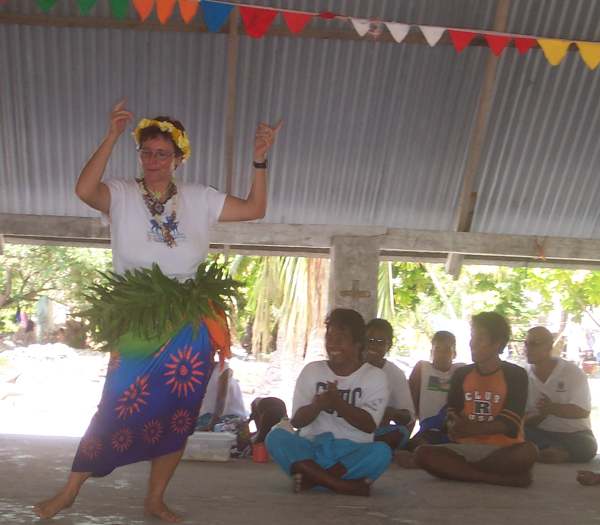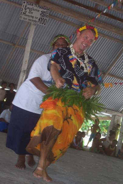 There were also three parties that we attended. At these events, in addition to great quantities of food, the locals danced and sang for us. Naturally, there were speeches all around, and we were also asked to tell the folks a bit about ourselves. At one party there was even a band. Then the party would liven up more with lots of people dancing, usually in pairs, or sometimes in a fun conga-type line in which the followers all copied whatever the leader was doing. There was very little rest for us I-Matang, who were frequently asked to dance. At one event, Bjarne and I were each asked to do a solo dance. Not being particularly gifted in this field, we each decided the best thing was to set dignity aside and have some fun. Thus, we each hammed it up as we undulated around the maneaba, with our hips encircled by fern fronds. Bjarne even finished his routine up with a front roll. Where else can you have such an experience?