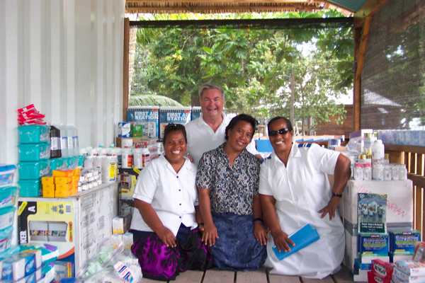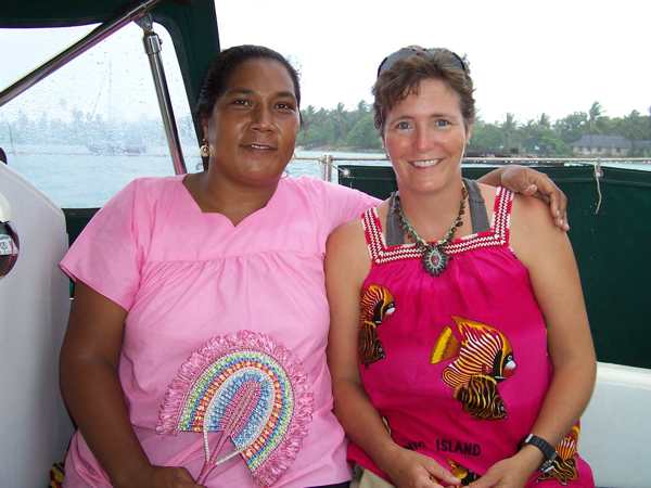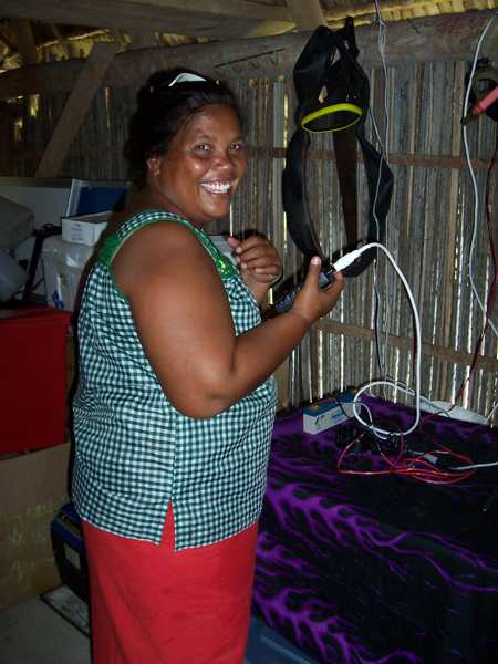 On an earlier visit, Carlton had provided the head nurse (Arote) with an SSB radio so she could communicate with the physician on Kiritimati (164 miles away), and with the other nurse on Teraina. On this trip he brought a fixed-mount VHF for Arote, and hand-held VHF radios and solar panels to power them for the other two nurses. Bjarne helped Carlton to set up the antenna for Arote's radio, located between the other two clinics, and there was no problem in communicating with the other two nurses. However, the two smaller radios (Nukai's and Rena's) didn't transmit quite far enough to reach each other. After consulting with Bjarne, Carlton arranged with Gordon West for some larger outdoor-mounted antennas to be sent on the next cruise ship to augment the hand-helds. Stepping up to larger radios would mean too much drain on the small batteries and solar panels that were providing power. The plan was to get the equipment off the ship as quickly as possible so Bjarne and Carlton could rush around to the two clinics (which were of course in opposite directions) while the tourists had their few hours in the sun, and then get Carlton loaded onto the ship and headed for home. It was arranged for Bjarne to finish up anything that didn't get done. On the day of the ship's arrival we were awakened early by howling winds and blasting rain. Nasty squalls plagued the island all morning and for a while it seemed doubtful that Carlton and the Water for Life people would even be able to get off the island! Certainly no tourists were coming ashore, which meant a lot of lost revenue for the islanders. In a testament to the high regard they have for Carlton, a contingent of women braved this weather by taking the early morning ferry over to say goodbye to him. The seas remained rough but the NCL crew managed to get the antennas onto the island and the visiting I-Matang safely back to the ship, where they could all enjoy a well-deserved rest, not to mention the cruise ship buffets (who's jealous?).