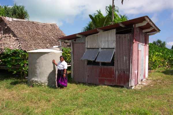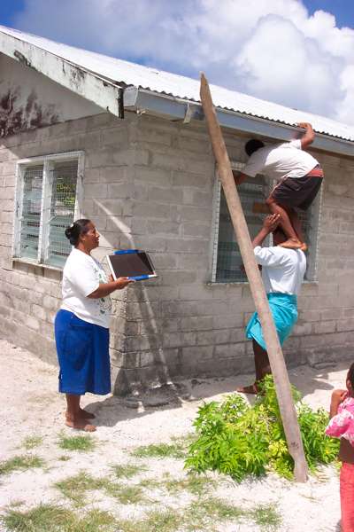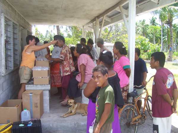This group came to test the ground water in many of the areas, and to build some water tanks for catching rain; they travel on their own time and at their own expense. As at Kiritimati, most locals drink the ground water, which is sometimes contaminated with bacteria if the well has been placed too closely to the “toilet facilities”. Human waste is usually dealt with by 'doing your business' on the shore where the waves should eventually wash it out to sea (making it a good idea to watch your step when walking along the shoreline), or by going into the bush. Some families have a toilet area, but many do not, and even the schools do not have a toilet – the kids just go into the nearby bush. Many folks boil the water but this doesn't address the second problem, which is the high salinity in the water. Lots of sugar is used to cover the salty taste, which contributes to the high rate of diabetes here. The rain cisterns are a simple design, using local or easy to get materials. The rain off of the traditionally-made roofs (made from pandanus leaves) is too contaminated, but many of the maneabas and schools have corrugated metal. The Water for Life folks built a few tanks, finished off some they had started a few months earlier, and did their best to pass on these skills and to convince people of the importance of having safe drinking water. The real challenge is the follow through – some of the partly done tanks could have been finished in the intervening months without too much difficulty but weren't. The group was hopeful that there were at least a few people who seemed keen to learn. In the meanwhile, the nurses' clinics now have tanks for good quality water, as do some community areas.