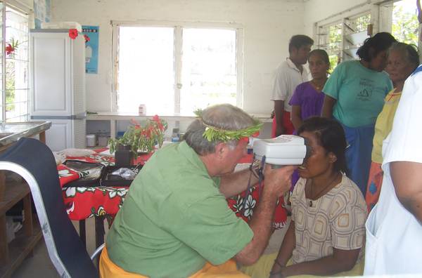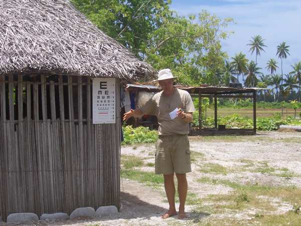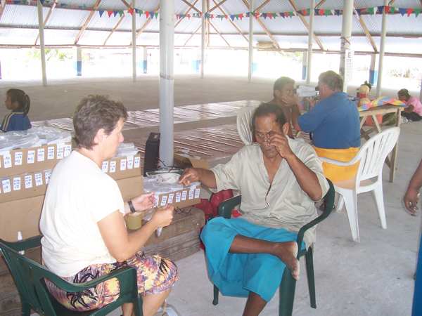 By the fourth and last clinic, we were quite an efficient team and had all learned a few more Kiribati words. The first step for a “patient” was to visit Bjarne, who screened them for distance vision, using the universal language eye chart (E's facing in different directions). Many people had never experienced having their eyes tested so a few got mixed up and would cover one eye with the “spoon” but then close their other eye. This created some entertainment for the others in the line, but it all seemed good natured. Bjarne explained, communicating with words and hand gestures that when he pointed at one of the E's, the person should point in the direction it was facing. Often they would barely flick a finger to indicate the direction of the letter so Bjarne had to become adept at interpreting the subtler hand movements of the Kiribati. If a problem was noted with their distance vision, the next step was to see Carlton, who determined a prescription by using a refractometer to measure the curvature of the lens. This nifty piece of equipment is quite expensive but he was able to borrow one with a deposit; the prescription is not quite as accurate as that determined by an optometrist, but the gadget is portable and can be used by a lay person. Prescription in hand, the person would then come to me, where I would try to find a pair of glasses that matched the prescription and hopefully fit. After a while, I got better at shaping the frames (I found a little butane torch and pliers in Carlton's kit) when we had a really hard to fit situation. We weren't measuring astigmatism but some of the the glasses had such correction, thus it was important for a person to try a few pairs on if there was more than one of a given prescription. Some of the people were very shy about saying what they preferred and I had trouble conveying that I wanted them to indicate which one was better. Sometimes someone would translate, otherwise we muddled through and it got easier when I learned to understand the word for “good”. Kiribati people don't nod in the affirmative; instead they kind of lift their head and eyebrows a little. I was never quite sure when someone was agreeing with me. We also had an area for folks to pick up reading glasses. We left this for the nurses or one of the women from the village health committee to run as our hands were full. People just tried out different reading glasses (all labelled according to strength) until they found ones that helped them to read the sample text. We often had a good audience of curious folk watching the proceedings.