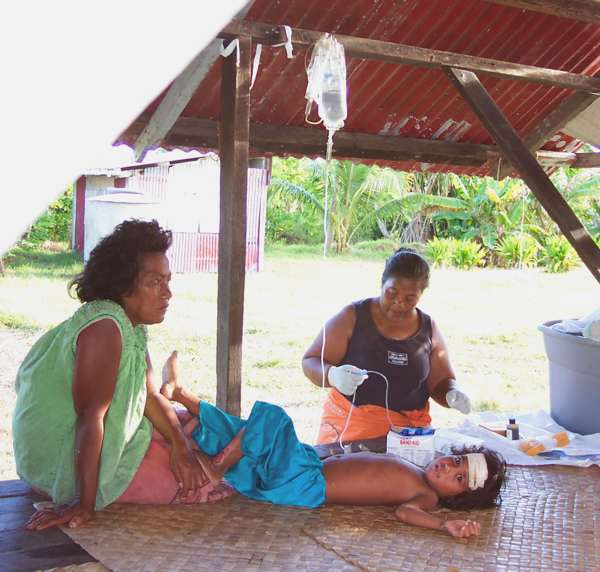 The three nurses were very pleased: how frustrating for a professional to know what is wrong, how to fix it, but not have the means to do so. In addition to the more obvious medical things like pharmaceuticals and bandages, he brought LEDs, small solar panels, and batteries for each clinic to provide some lighting, as well as cabinets for storing the supplies. One clinic was a small cinder block room separated from the nurse's home. It had the new cabinets, a counter with some mostly empty shelves and linoleum tiles over the cement floor. It is on this floor, on a pandanus mat, that women from that village come to give birth. The other two clinics were simply part of the nurses' homes. Patients were often seen and treated on the nearby raised platforms which were made from coconut fronds and covered with pandanus leaves, hardly a sterile, or private, environment.