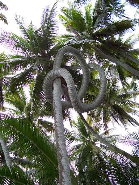 On the second day we borrowed bicycles to get out to the other clinic, where, after a visit with the nurse (Rena) and some neighbours, the antenna was quickly taken care of. As arranged previously, we were then taken by guides on a long bike ride (almost an hour) to see a very peculiar coconut tree. Somehow it had grown in big loops - amazing! One of the guides quickly climbed up, and then cut notches in the tree for his companions. Even with the notches BJ got only partway up, and I didn't even try. The bike ride was fun: it took us along what seemed to be an old road, very overgrown and narrow now, left over from when the island was important from a communications standpoint. We had to carry the bikes across various salt water inlets, and dodge the ubiquitous puddles along the way. On the way back we abandoned our guides and went a little further into some woods that Bjarne had come across previously, where the white birds seemed quite curious about us. They would hover just above our heads, but again, only if the camera had been put away!