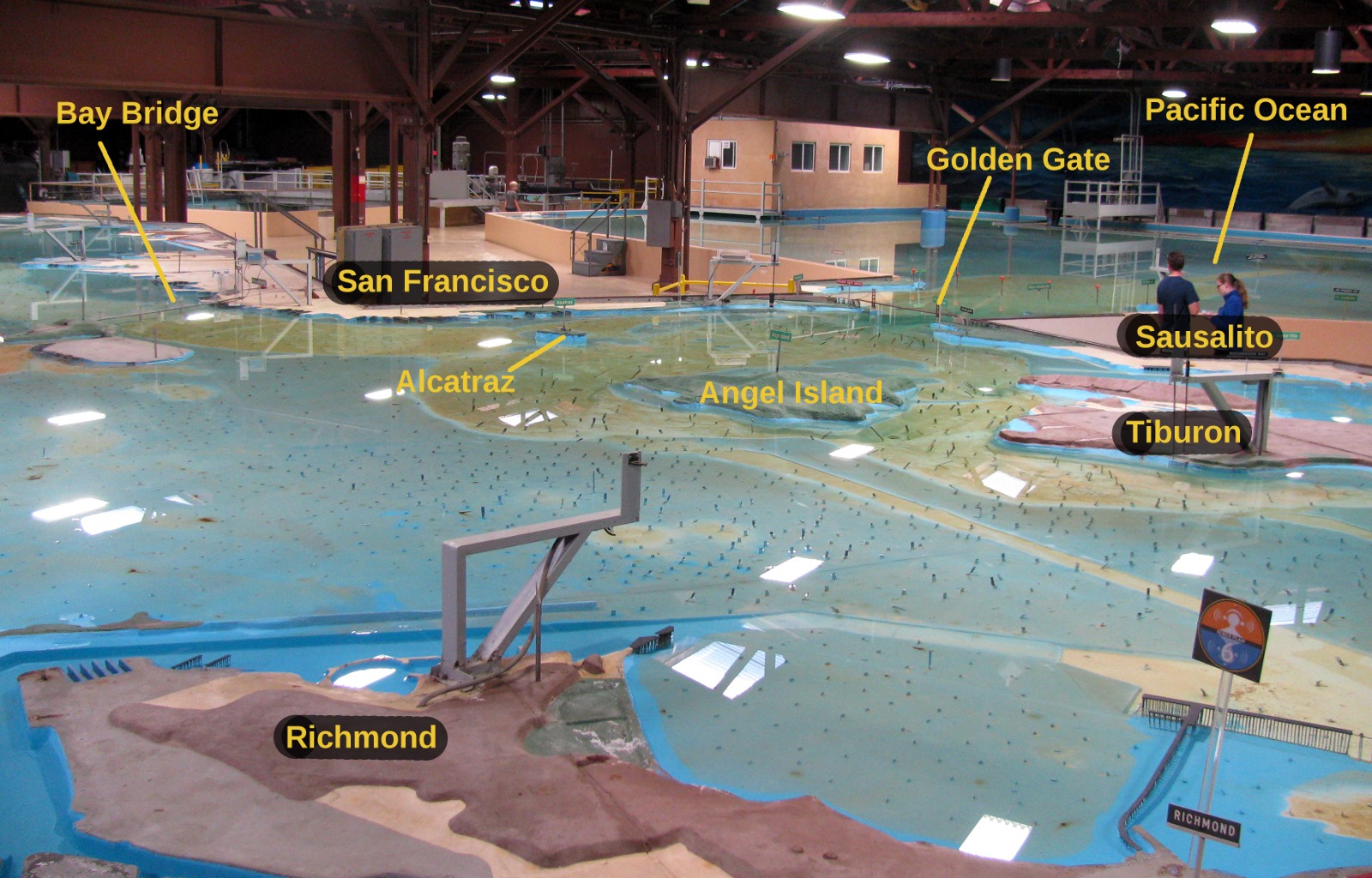 This model of the San Francisco Bay and Delta area takes up about 1.5 acres and has working tides and currents. It was built by the US Army Corps of Engineers and used for research for many years, until advances in computer modelling made it obsolete. It is now an educational centre. The impetus to create it was a proposal to build a couple of dams and turn a lot of the Bay area into fresh water lakes. The Bay Model allowed them to determine that this wasn't a good idea.