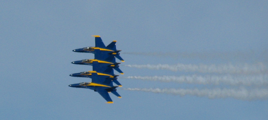A slow-speed pass of the Blue Angels, tailing the private Oracle Corp aircraft.