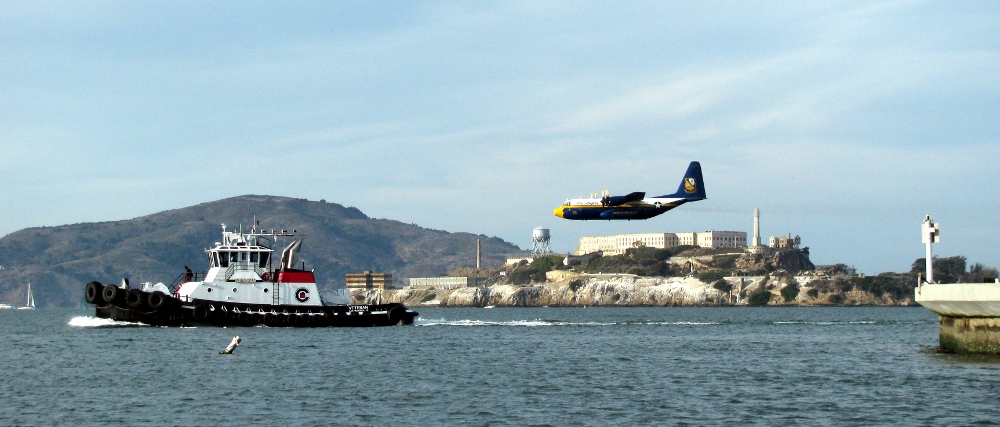 Aquatic Marine Park also gave us a front-row spot for enjoying the Fleet Week Airshow. To the north is Alcatraz and the Blue Angels' support/spotter aircraft taking a pass.