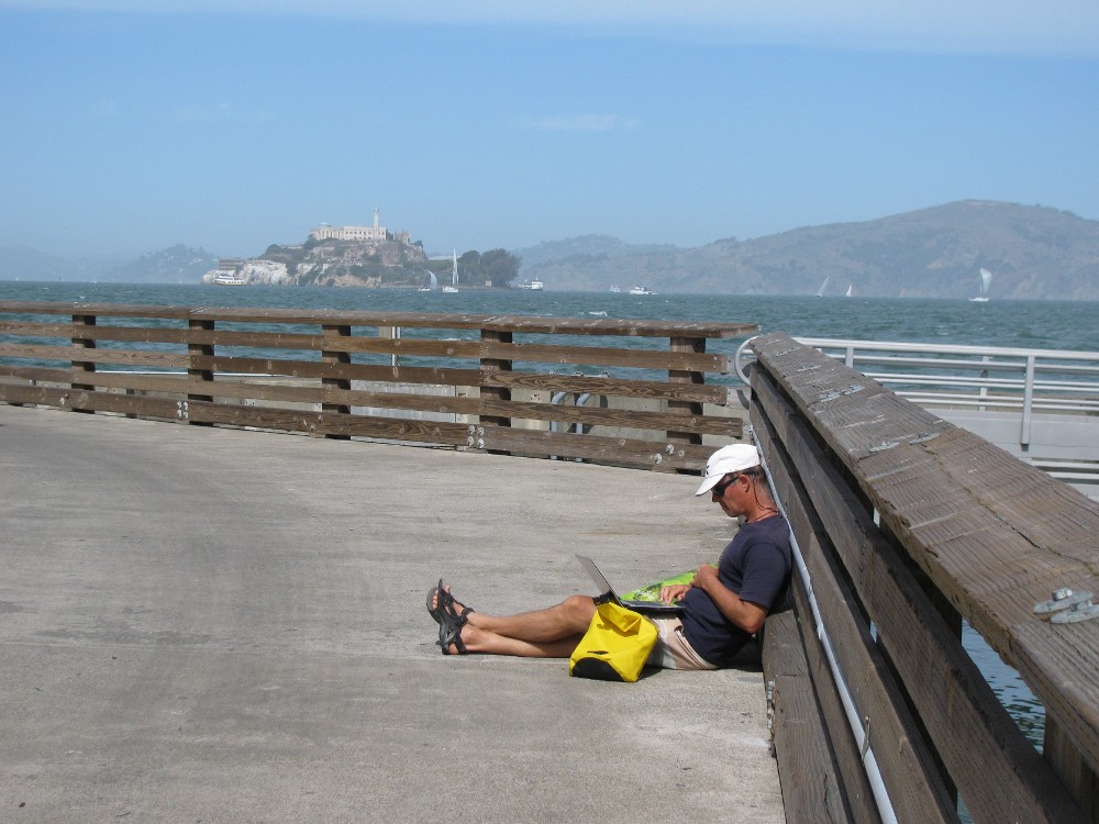 Wi-fi is where one finds it... Checking email with Alcatraz in the background.