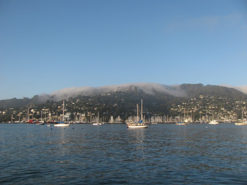 Fog creeping over the hills of Sausalito, seen from Richardson Bay anchorage.