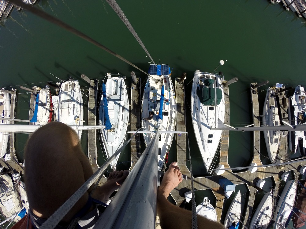 We were up and down the mast several times. We needed to: inspect the broken headfoil; fix the masthead tricolour light; remove the tape from the new headfoil (put on by rigger); and take down each synthetic stay so we could sew up the splices to reduce slippage. The stays are the lines holding the mast up, therefore we could only take down two at a time.